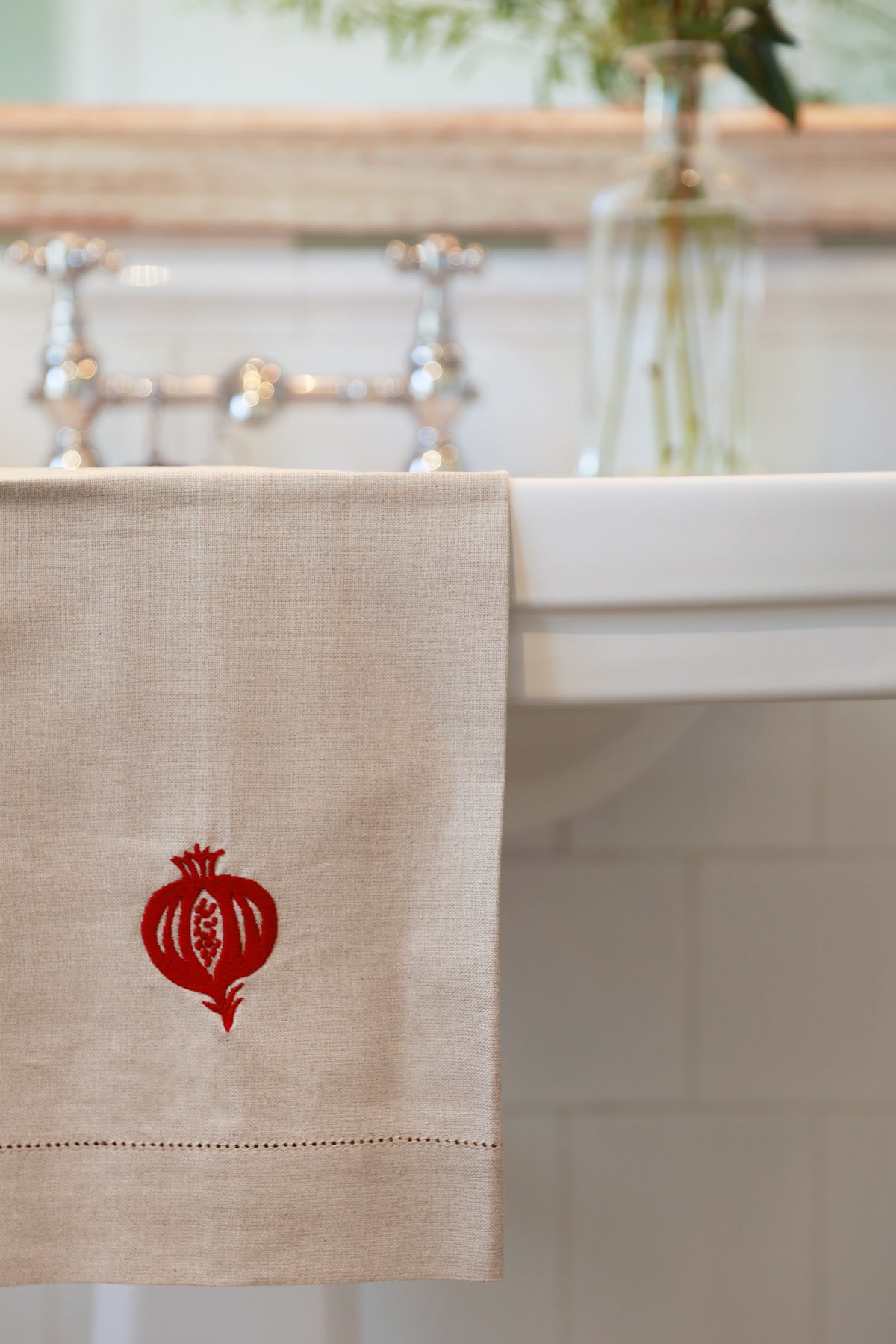 Create a beautiful space for your guests by adding flowers, a scented candle, and this beautifully embroidered guest towel.